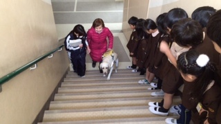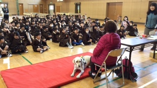12月8日(月) 3年生は国語で「もうどう犬の訓練」を学習しています。今日は視覚障がいのある山本さんが、盲導犬のフェリシアを連れて学校に来てくださいました。3年生の子どもたちは山本さんとフェリシアに会うのをとても楽しみにしていました。