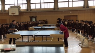 その後、階段昇降のデモンストレーションを見せてもらったり、音のするピンポン球を使った目の不自由な人の卓球を体験したり、アイマスクを着けた友だちを誘導する体験をしたりしました。また、子どもが読んだ学習発表会の台本を山本さんが点字で打って、それをスラスラ読まれたのにはびっくりしていました。