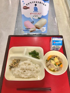 上段の写真は、本日の給食のサンプルと給食図書です。本日の給食図書は、「すがたをかえる食べもの 魚がへんしん!」でした。かまぼこやかつおぶし、ツナ缶等、主に魚の加工品が載っている図書でした。
