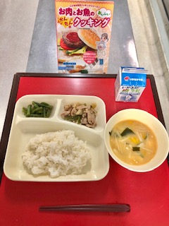 上段の写真は、本日の給食のサンプルと給食図書です。本日の給食図書は、「お肉とお魚のかんたんクッキング」でした。いろいろなお肉料理とお魚料理が載っている児童向けの料理本でした。