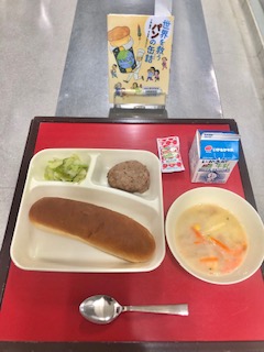 上段の写真は、本日の給食のサンプルと給食図書です。本日の給食図書は、「世界を救うパンの缶詰」でした。防腐剤無添加で3年間そのまま保存できるパンの缶詰を開発した、小さなパン屋さんのお話でした。
