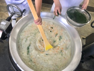 下段の写真は、豆乳スープにパセリを加えて仕上げているところです。
