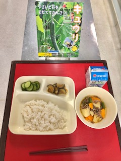 9月1日(火)の献立は、「ごはん・肉じゃが・焼きなすのみそだれかけ・あっさりきゅうり・牛乳」でした。