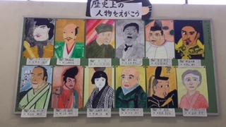 さて鶴見南小学校に、聖徳太子や織田信長など「歴史上の人物」がやって来ました!と言っても、階段の6年掲示板の話です。これは社会科で歴史を学習をしている6年生がそれぞれ人物を選び、図工の時間に描いたものです。階段を通る他の学年の児童や、教職員の間でも「じょうずに描けてるなぁ。」「さすが6年生!」と評判になっています。6年生はこの絵をもとに次は版画に挑戦するそうです。こちらもどんな作品ができるか楽しみですね。