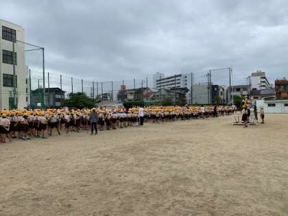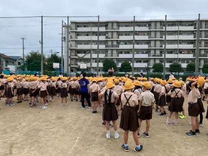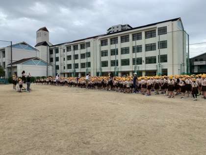 朝は久しぶりに運動場で児童集会をしました。8:30までに全児童が運動場へ集合して、集会委員の話を聞きました。