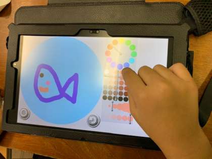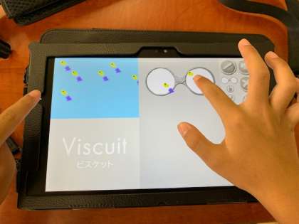 本日使用したのはViscuit(ビスケット)というアプリで、児童がそれぞれ魚の絵を描いて「水槽」に入れます。次にその魚をメガネ型の「窓」に入れると、水槽に入れた魚が泳ぎだすという仕組みです。このアプリはインターネットでダウンロードできるので可能ならばお家でも楽しんでみてください。