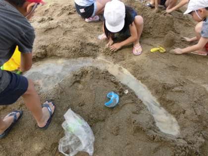 生活科と図画工作科の学習でどろんこ遊びをしました。今日は1組と2組でした。用意しておいたよごれてもよい服を着て、おもいっきり楽しんでいました。山を作ってトンネルを掘ったり、堀った穴に水を満たして「海」を作ったり、どろだらけになりながらいきいきと活動していました。