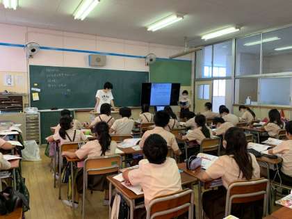 2年生は国語で「にたいみのことば」の学習をしています。「たいよう」と「お日さま」ではどう違いますかという発問に対して、子どもたちはいろいろな使い方を考えて発表していきます。