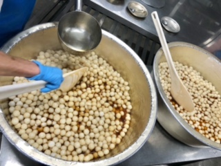 下段の写真は、みたらしだんごのだんごとたれを合わせている様子です。