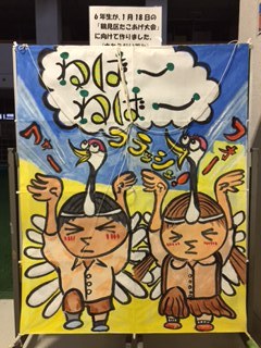 現在、グリーンマットに大凧が展示してあります。これは12月の5年の凧作りの時にいただいていたものに6年生が絵を描いたものです。今年は6年のテーマ「ねばーねばーフラッシュ」が描かれています。登校してきた低学年の子どもたちは「すごいなー」と言って見ています。