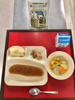 上段の写真は、本日の給食のサンプルと給食図書です。本日の給食図書は、「鰹のたんぽぽ釣り」でした。魚が空を飛び、鳥は地中を泳ぐふしぎな世界の物語でした。