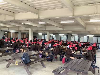 ただ小雨が降っていますので、宿舎前ではなく、飯盒炊さん場のところで、活動班ごとに食べています。