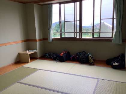 写真は、子どもたちのいなくなった部屋と、宿舎前に並んでいる様子です。