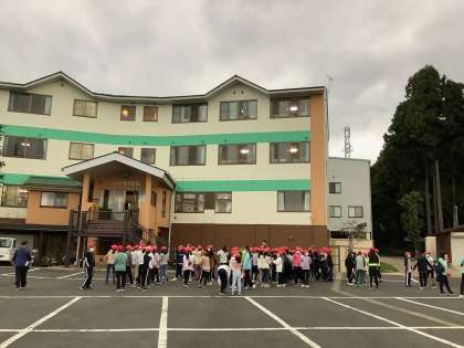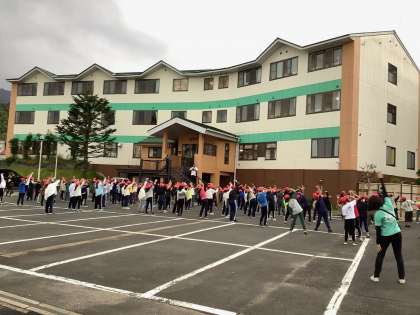 写真は、集合してきている様子とラジオ体操を行っている様子です。