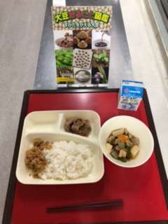 上段の写真は、本日の給食のサンプルと給食図書です。本日の給食図書は、「大豆まるごと図鑑」でした。大豆が納豆やみそ、とうふ等いろいろな食品に姿をかえることがわかる図鑑でした。