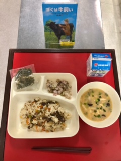 上段の写真は、本日の給食のサンプルと給食図書です。本日の給食図書は「僕は牛飼い」でした。牛の品評会で一等賞を狙う少年の物語でした。
