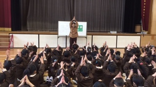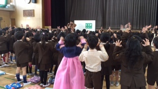 これは日本とお隣の国で、歴史的にも関係が深い韓国・朝鮮について毎年1年生が学習しているものです。今年も去年に続いてキムガンジソンセンニム(先生)が来てくださいました。初めに「アンニョンハセヨ」(こんにちは)という挨拶を教えてもらい、それからペンイ(コマ)や、チェギという足を使った遊び、「カウィ、バウィ、ボ」と言うジャンケン等を教えてもらいました。チマチョゴリというきれいな着物も着せてもらいました。最後に「トラよりこわいくしがき」という楽しい話を聞かせてもらい、「コマスミダ」(ありがとう)、「アンニョンヒカセヨ」(さようなら)と言ってソンセンニムとお別れしました。