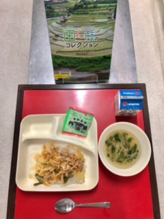 上段の写真は、本日の給食のサンプルと給食図書です。本日の給食図書は「田んぼのコレクション」でした。日本人の文化とくらしを支えてきた田んぼや米作りのことがわかる図書でした。