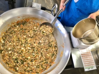 下段の写真は、ピリ辛丼の具を配缶しているところです。