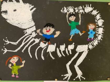 1年生は「ほねほねきょうりゅう」の絵を描きました。黒い画用紙に白いパスできょうりゅうの骨格をのびのびと描き、そこで子どもたちが楽しく遊んでいます。