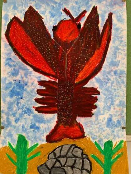 2年生は「ザリガニ」の絵を描きました。画用紙から飛び出しそうな元気なザリガニの様子が伝わってきます。
