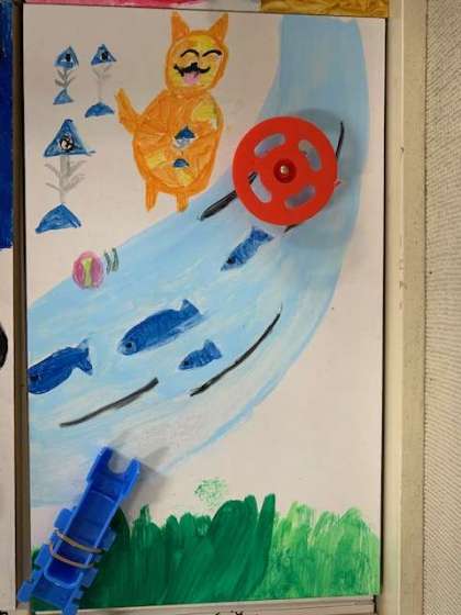 3年生は「くぎうちゲーム」を作っています。板に絵を描き、釘を打ったり、回転する部品を取り付けたりして楽しく遊べるゲームを作ります。まだ製作途中ですが、一生懸命取り組んでいます。
