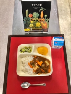 上段の写真は、本日の給食のサンプルと給食図書です。本日の給食図書は「キャベツ姫」でした。王様の悪口のせいで、お姫様がキャベツになってしまうお話でした。