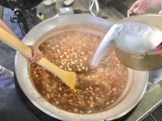下段の写真は、ハヤシライスに水溶き上新粉を加えているところです。