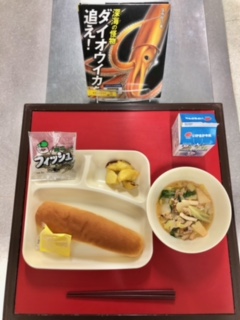 上段の写真は、本日の給食のサンプルと給食図書です。本日の給食図書は、「深海の怪物ダイオウイカを追え!」でした。謎に包まれたダイオウイカの生態にせまる図書でした。