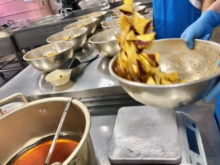 下段の写真は、揚げたさつまいもにみつをからめているところです。