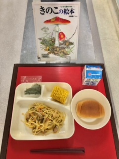 上段の写真は、本日の給食のサンプルと給食図書です。本日の給食図書は、「きのこの絵本」でした。森や公園等に生息しているきのこが描かれた絵本でした。