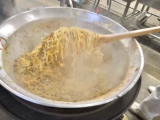ウインナーときのこのしょうゆ風味スパゲッティは、具材にカットウインナー、しいたけ、しめじ、たまねぎ、ピーマン等が入った、しょうゆ風味の麺料理でした。