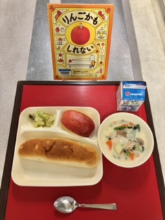 りんごは、本日は青森県産のふじ(早生)が1人に1/4個(1年生は1/8個が2個)付きました。