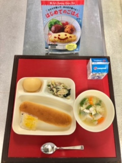 上段の写真は、本日の給食のサンプルと給食図書です。本日の給食図書は、「はじめてのごはん」でした。グラタンやハムエッグ、ハンバーグ等が子どもでも作れるように工夫された児童用の料理本でした。