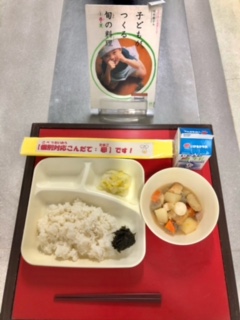 上段の写真は、本日の給食のサンプルと給食図書です。本日の給食図書は、「子どもがつくる旬の料理」でした。
