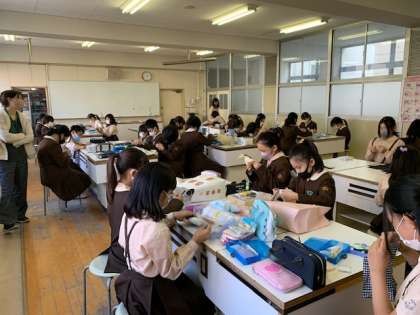 手芸クラブは家庭科室で活動しています。各自が持ってきたかわいい布でそれぞれが小物を作っています。
