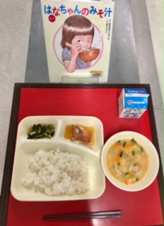 上段の写真は、本日の給食のサンプルと給食図書です。本日の給食図書は、「はなちゃんのみそ汁」でした。お父さんと女の子が、亡くなったお母さんに教わったみそ汁を作る絵本でした。