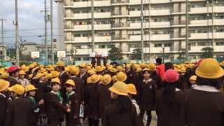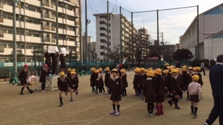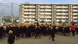 1月29日(木)児童集会でゲームをしました。寒い朝でしたが、インフルエンザ流行予防ということもあって、講堂ではなく、運動場に「なかよし班」で集まりました。