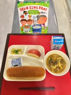 上段の写真は、本日の給食のサンプルと給食図書です。本日の給食図書は、「うどんはどこからきたの?」でした。おばあちゃんと孫娘が一緒に、小麦粉からカレーうどんを作る絵本でした。