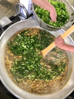 下段の写真は、カレーうどんに青ねぎを加えて仕上げているところです。