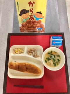 12月11日(金)の献立は、「おさつパン・鶏肉のからあげ・中華みそスープ・もやしとコーンの甘酢あえ・牛乳」でした。