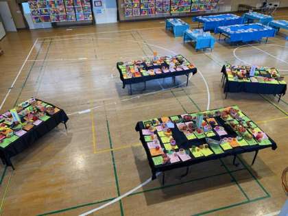 5年生は「いらっしゃいませ 〜八百屋でお買い物はいかが?〜」という題で、紙粘土を使って、ニンジンやリンゴ等の野菜や果物をリアルに作りました。