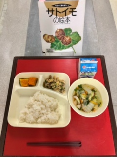 上段の写真は、本日の給食のサンプルと給食図書です。本日の給食図書は、「サトイモの絵本」でした。さといもやずいきの、育て方や食べ方が載っている絵本でした。