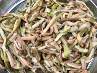 中段の写真は、揉み洗いしぬるま湯で戻したずいきです。ずいきとはさといもの葉柄の部分のことです。何度も水を替え、もみ洗いを繰り返すことでアクを抜きました。