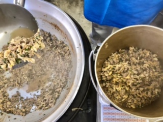 豚肉と干しずいきのみそ煮は、豚肉、ずいき、うすあげ、青ねぎが入ったみそ煮でした。給食室で乾物のずいきを揉み洗いし、ぬるま湯で戻してから使用しました。