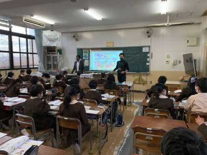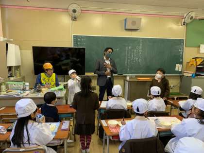 C-NETのRobert先生は給食の時間に全クラスを回ってくださっていますが、今日は1年生のクラスに入りました。一緒に給食を食べた後「インタビュータイム」ということで、1年生が先生に教えてもらいながら、英語で"When is your birthday?"等の質問をしました。Robert先生も英語で答えましたが、ジェスチャーやヒントで子どもたちはよく理解していました。
