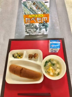上段の写真は、本日の給食のサンプルと給食図書です。本日の給食図書は、「こうじょうたんけん たべもの編2」でした。ツナ工場やシューマイ工場で食べものが作られる様子がわかる図書でした。