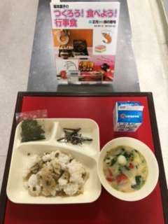 上段の写真は、本日の給食のサンプルと給食図書です。本日の給食図書は、「つくろう!食べよう!行事食 正月から桃の節句」でした。ぞう煮や、ごまめ、ちらしずし等の作り方が載っている行事食の料理本でした。