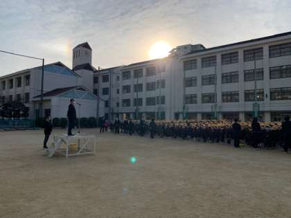 今日は寒い朝になりましたが、子どもたちは元気に登校してきて、1時間目に運動場で3学期の始業式をしました。校長先生からは「今日の始業式に臨んでいる皆さんの態度は大変りっぱです。3学期は短い期間ですが、6年生は卒業式に向けて、1〜5年生は修了式に向けてがんばってください。」というお話がありました。