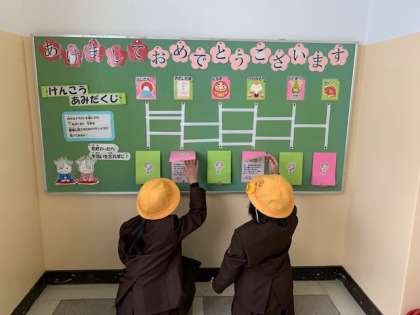 保健室の横には養護教諭が「けんこうあみだくじ」を掲示しているので、子どもたちが楽しく見ています。